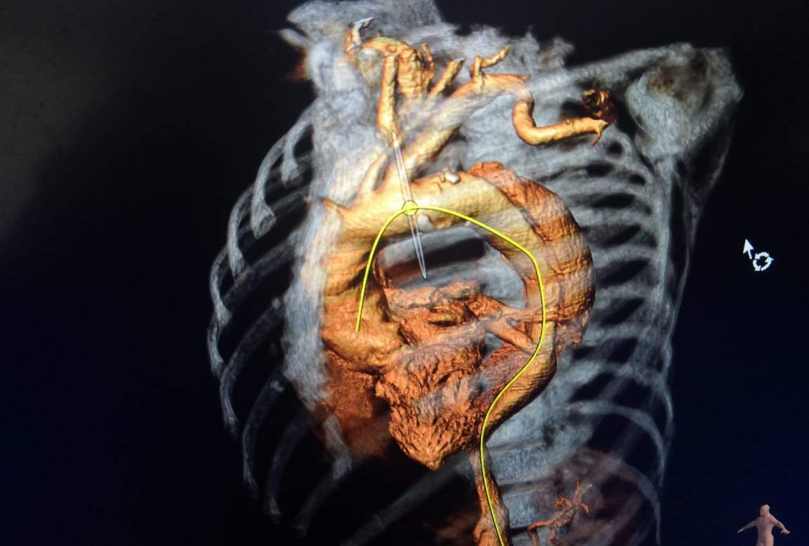 وقام فريق من جراحي الأوعية الدموية برئاسة الدكتور مسعد سليمان مدير مركز جراحة الأوعية الدموية، وبحضور ممثلين لجراحي القلب وفريق العناية بإجراء قسطرة تداخلية لتصحيح انشطار بشريان الاورطي الصدري نتيجة الارتفاع المزمن بضغط المريض وأدي الانشطار الي تمدد بشريان الاورطي منذرا بحدوث انفجار علاوة علي توقف الدورة الدموية عن بعض الاعضاء الحيوية.