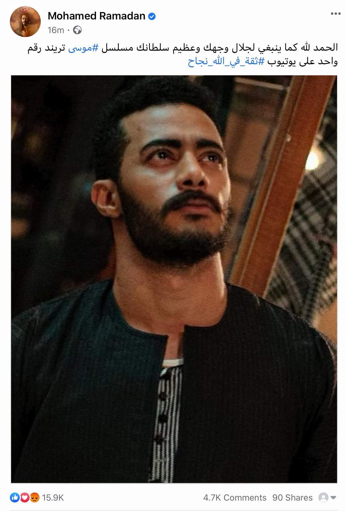 ونشر رمضان عبر حسابه علي "فيس بوك" صورة من مسلسل موسي معلقا/4330356 عليها بقوله :”الحمد لله كما ينبغي لجلال وجهك وعظيم سلطانك مسلسل #موسى تريند رقم واحد على يوتيوب #ثقة_في_الله_نجاح”
