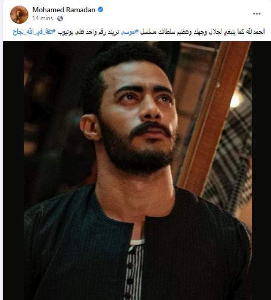وكتب محمد رمضان تدوينة على الفيس بوك معبرًا عن سعادته "الحمد لله كما ينبغي لجلال وجهك وعظيم سلطانك مسلسل #موسى تريند رقم واحد على يوتيوب #ثقة_في_الله_نجاح"