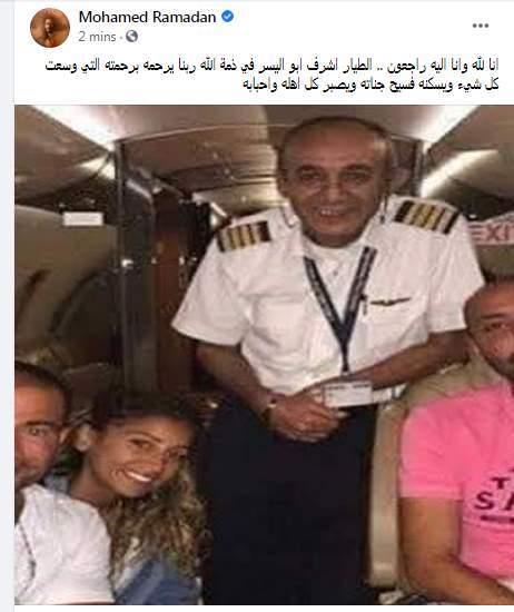 وهنا رد محمد رمضان وكتب معلقًا على وفاة الطيار على الفيس " انا لله وانا اليه راجعون .. الطيار اشرف ابو اليسر في ذمة الله ربنا يرحمه برحمته التي وسعت كل شيء ويسكنه فسيح جناته ويصبر كل اهله واحبابه"