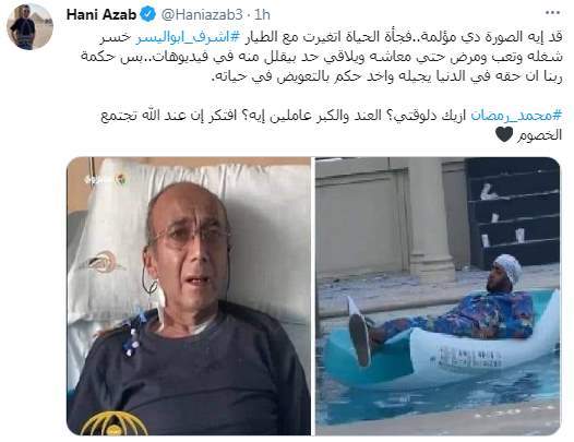 قال هاني عز العرب " قد إيه الصورة دي مؤلمة..فجأة الحياة اتغيرت مع الطيار #اشرف_ابواليسر خسر شغله وتعب ومرض حتي معاشه ويلاقي حد بيقلل منه في فيديوهات..بس حكمة ربنا ان حقه في الدنيا يجيله واخد حكم بالتعويض في حياته.. #محمد_رمضان ازيك دلوقتي؟ العند والكبر عاملين إيه؟ افتكر إن عند الله تجتمع الخصوم"
