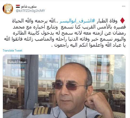 وعلق ستورم شادو " وفاة الطيار #اشرف_ابواليسر ..الله يرحمه والله الحياة قصيره بالأمس القريب كنا نسمع ونتابع اخباره مع محمد رمضان عن ازمته معه لانه سمح له بدخول كابينة الطائره واليوم نسمع خبر وفاته الدنيا راحله والمناصب زائله فاتقوا الله يا عباد الله واعلموا انكم اليه راجعون "