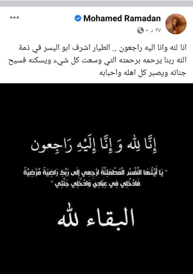 نعي الفنان محمد رمضان، الطيار أشرف أبو اليسر، الذي وافته المنية صباح اليوم السبت.