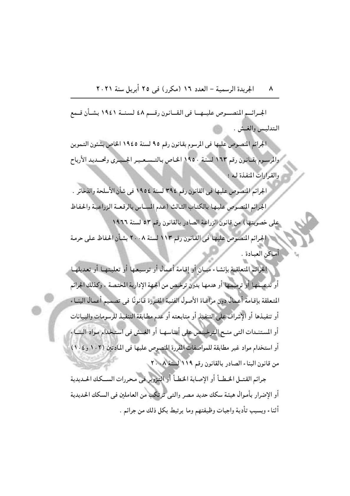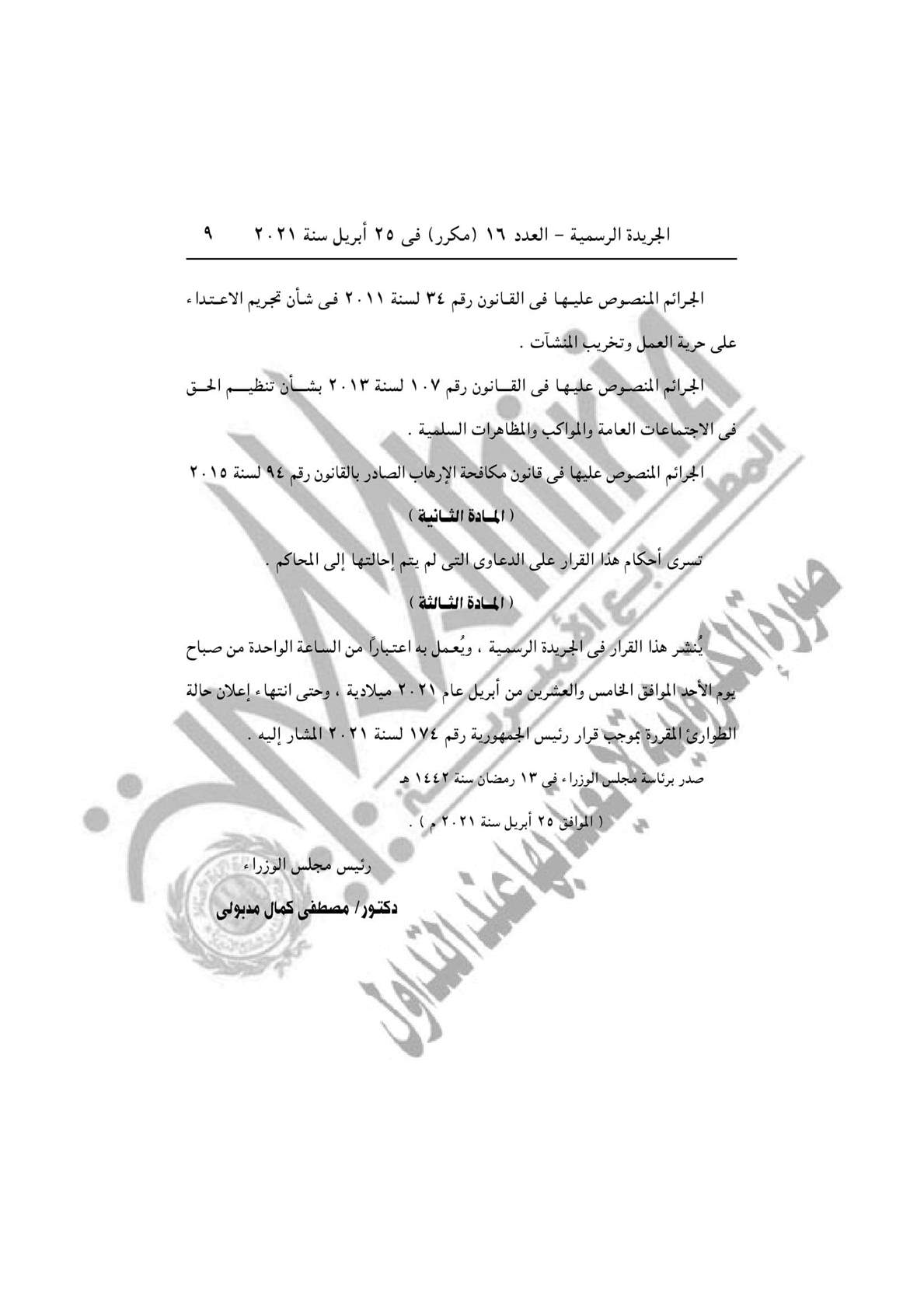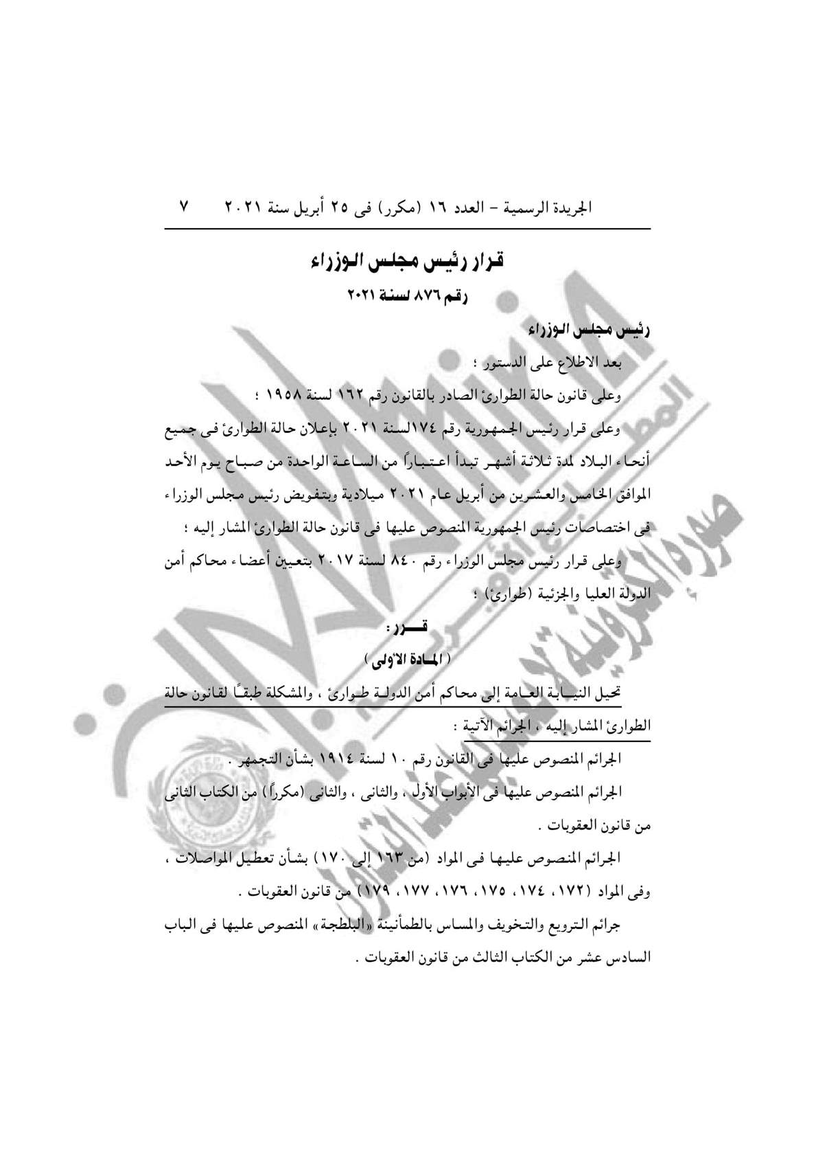 ويعمل بالقرار اعتبارًا من الساعة الواحدة من صباح اليوم الأحد الموافق 25 أبريل الجارى، حتى انتهاء مد حالة الطوارئ بموجب قرار رئيس الجمهورية.