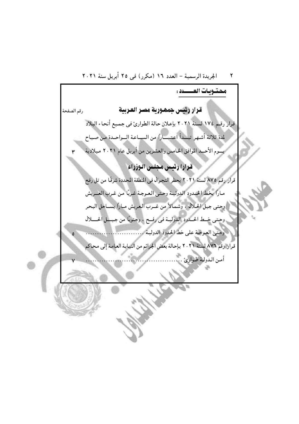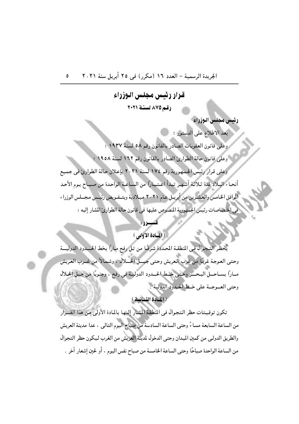 نشرت الجريدة الرسمية قرار الدكتور مصطفى مدبولي، رئيس الوزراء، بحظر التجوال فى عدد من المناطق بشمال سيناء فى المنطقة المحددة شرقًا من تل رفح مارا بخط الحدود الدولية وحتى العوجة غربًا من غرب العريش وحتى جبل الحلال، وشمالًا من غرب العريش مارا بساحل البحر وحتى خط الحدود الدولية فى رفح، وجنوبًا من جبل الحلال وحتى العوجة على خط الحدود الدولية.