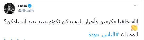 وكتبت إليسا "الله خلقنا مكرمين وأحرار، ليه بدكن تكونو عبيد عند أسيادكن؟.. المطران #الياس_عودة"