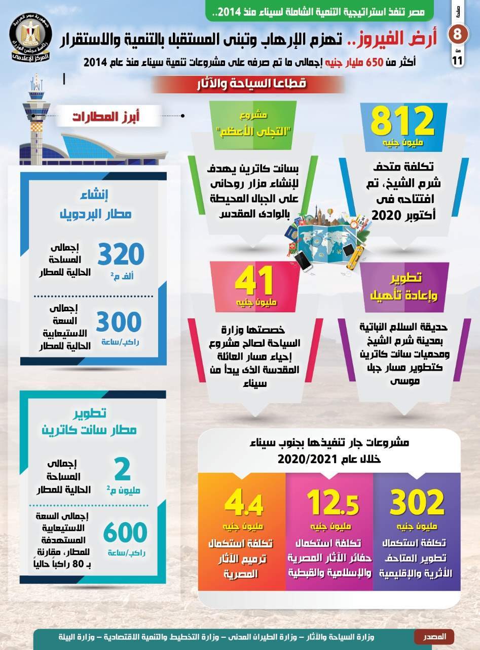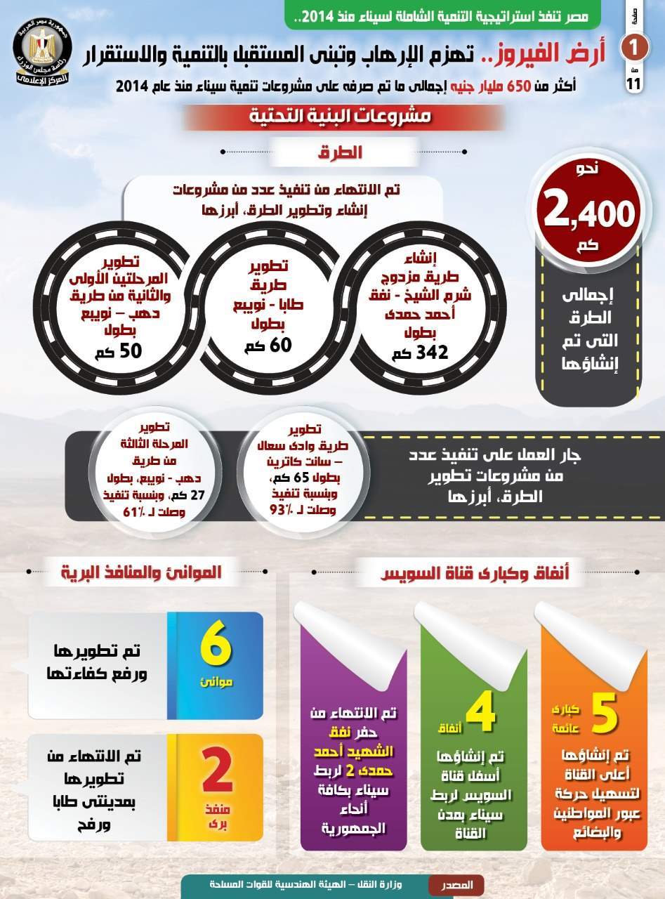 ونشر المركز الإعلامي لمجلس الوزراء، تقريراً تضمن إنفوجرافات تسلط الضوء على حرص الحكومة على الاستمرار في تنفيذ استراتيجية التنمية الشاملة لسيناء منذ عام 2014.