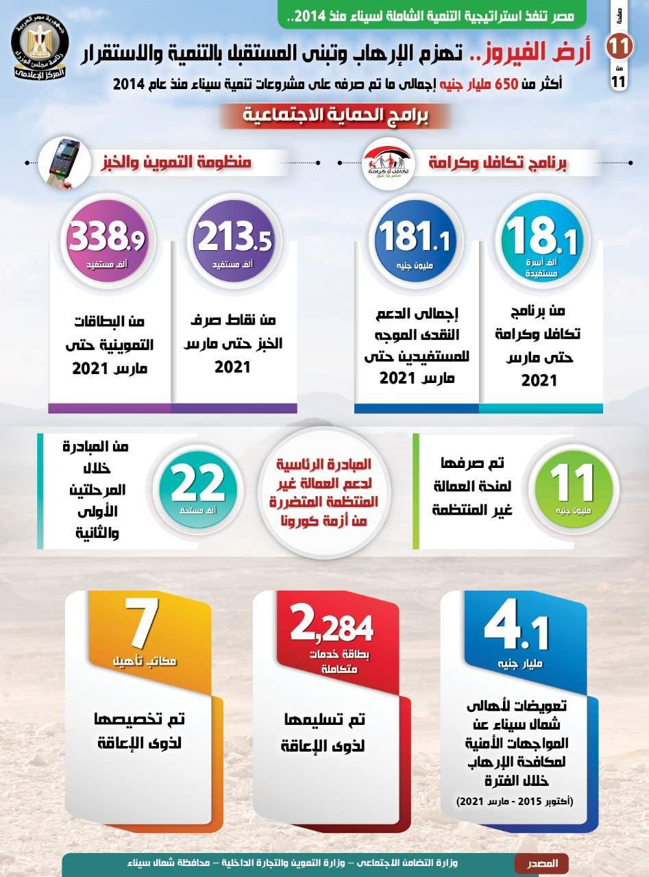 وبشأن جهود تحقيق الحماية الاجتماعية لأهالي سيناء، وصل عدد المستفيدين من برنامج تكافل وكرامة إلى 18.1 ألف أسرة مستفيدة حتى مارس 2021 بإجمالي دعم نقدي موجه للمستفيدين بلغت قيمته نحو 181.1 مليون جنيه.