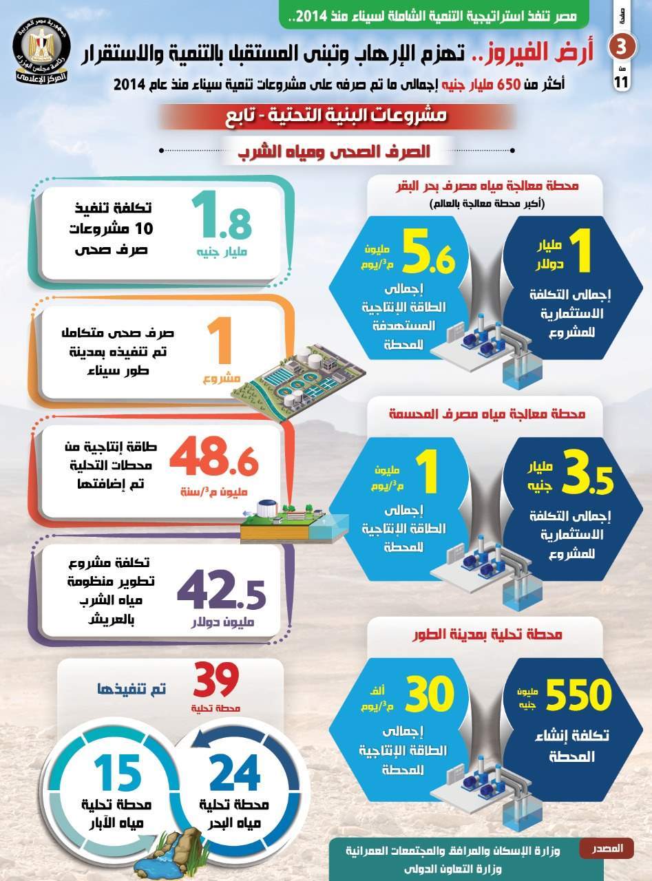وبلغت تكلفة تنفيذ 10 مشروعات صرف صحي بسيناء 1.8 مليار جنيه، في حين تم تنفيذ مشروع صرف صحي متكامل بمدينة طور سيناء، وإضافة 48.6 مليون م3/سنة طاقة إنتاجية من محطات التحلية بسيناء.