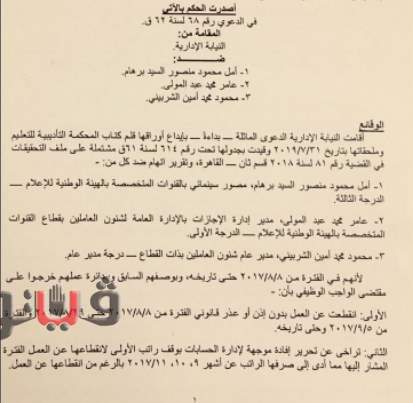 وقالت المحكمة عبر حيثيات حكمها أن المحالة الأولى أمل محمد منصور، مصورة سينمائية بقطاع القنوات المتخصصة بالهيئة الوطنية للإعلام إنقطعت عن العمل دون إذن أو اعتذار بعذر مقبول، وقد تبين بالأوراق على نحو لا يقبل الشك أو التأويل أنها انقطعت عن عملها في تلك الفترة، دون محاجة بأنها تعرضت لحادث سير، ذلك أنها وإن كانت قد تلقت الإسعافات بمستشفى 6 أكتوبر المركزي.