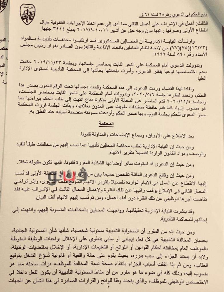 وبشأن المحالَين الثاني عامر محمد عبد المولى، مدير إدارة الأجازات بالإدارة العامة لشئون العاملين بالقطاع والثالث محمود محمد أمين، مدير عام شئون العاملين، فإن الأوراق أفادت بأنهما أَرسلا إنذارا أول للمحالة الأولى بناء على كتاب مدير عام الإدارة العامة للتصوير في شأن انقطاعها عن العمل والمؤشر عليه بالإحالة إليهما من رئيس قطاع قنوات النيل المتخصصة