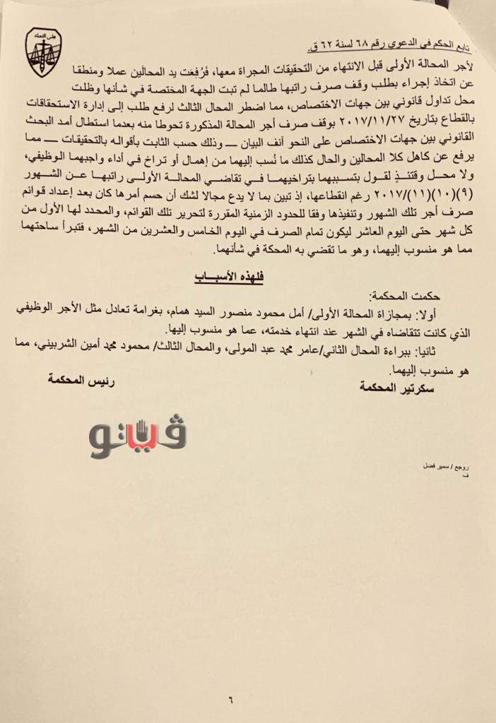 وانتهت المحكمة إلى مجازاة المحالة الأولى أمل محمود منصور، بغرامة تعادل مثل الأجر الوظيفي الذي كانت تتقاضاه في الشهر عند انتهاء خدمته، عما هو منسوب إليها، وبراءة المحال الثاني عامر محمد عبد المولى، والمحال الثالث محمود محمد أمين، مما هو منسوب إليهما.