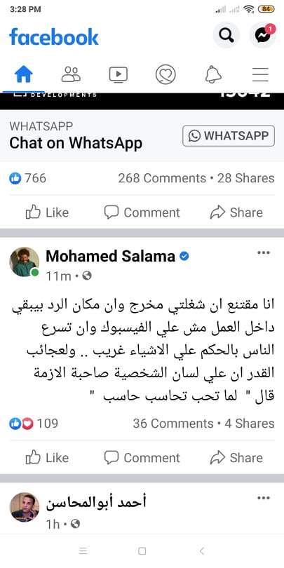 وكتب سلامة عبر حسابه على الفيس بوك:"أنا مقتنع إن شغلتي مخرج وإن مكان الرد بيبقي داخل العمل مش علي الفيس بوك وإن تسرع الناس بالحكم علي الأشياء غريب .. ولعجائب القدر أن علي لسان الشخصية صاحبة الأزمة قال " لما تحب تحاسب حاسب".