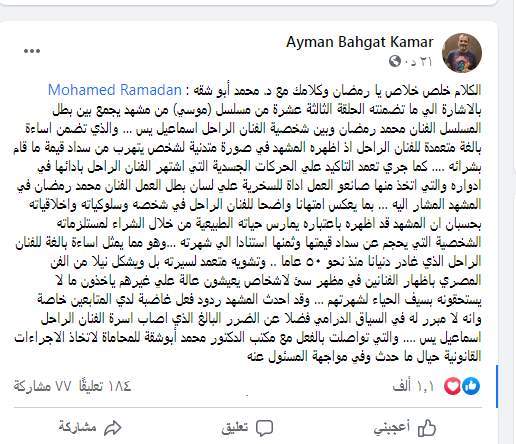 وقال أيمن فى منشور عبر حسابه على "فيس بوك" :"بالإشارة إلى ما تضمنته الحلقة الثالثة عشرة من مسلسل (موسي) من مشهد يجمع بين بطل المسلسل الفنان محمد رمضان وبين شخصية الفنان الراحل اسماعيل يس، والذي تضمن اساءة بالغة متعمدة للفنان الراحل إذ أظهره المشهد في صورة متدنية لشخص يتهرب من سداد قيمة ما قام بشرائه".