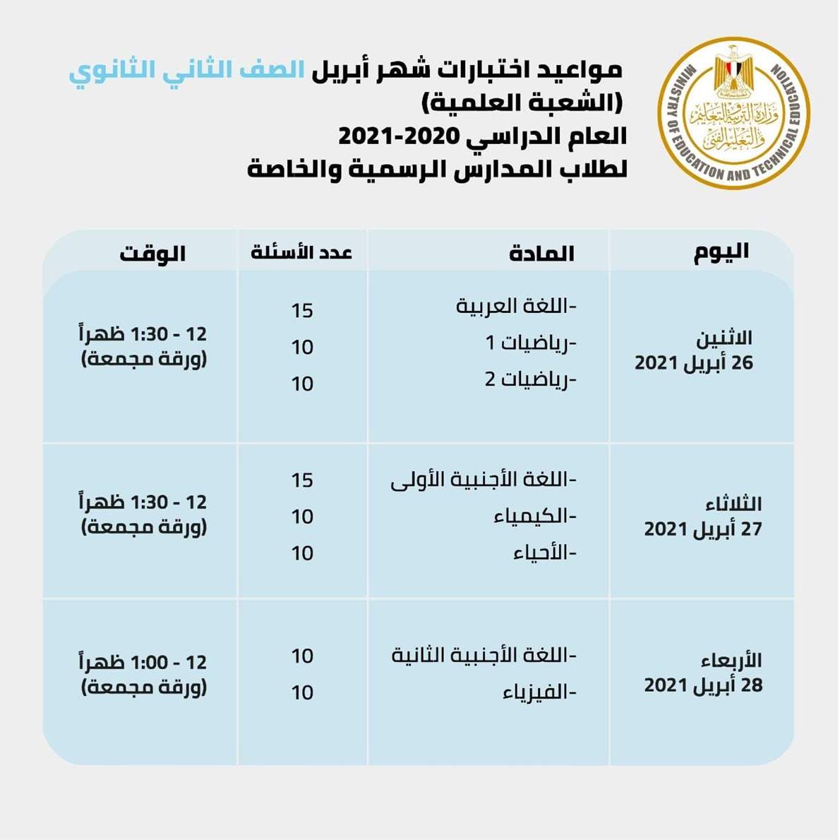 جدول امتحانات الصف الثاني الثانوي لشهر أبريل