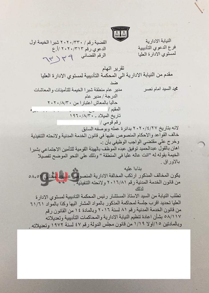 إحالة مدير عام منطقة شبرا الخيمة للتأمينات والمعاشات للمحاكمة التأديبية