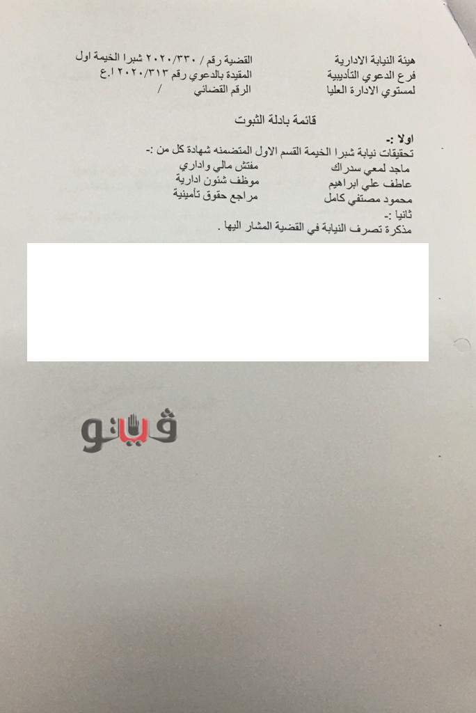 وتضمنت قائمة أدلة الثبوت محاضر تحقيقات النيابة الإدارية، وأقوال الشهود ماجد لمعي سيدراك، المفتش المالي والإداري وعاطف علي إبراهيم، موظف الشئون الإدارية ومحمود مصطفى كامل، مراجع الحقوق التأمينية، ومذكرة التصرف في القضية.