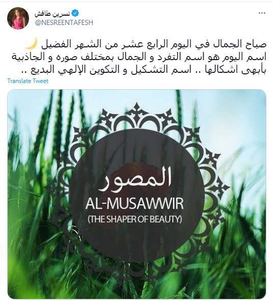 وكتبت نسرين طافش تغريدة على تويتر "صباح الجمال في اليوم الرابع عشر من الشهر الفضيل.. اسم اليوم هو اسم التفرد و الجمال بمختلف صوره والجاذبية بأبهى اشكالها.. اسم التشكيل والتكوين الإلهي البديع.." ؟