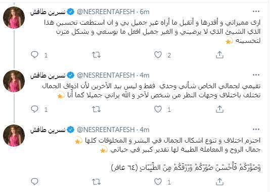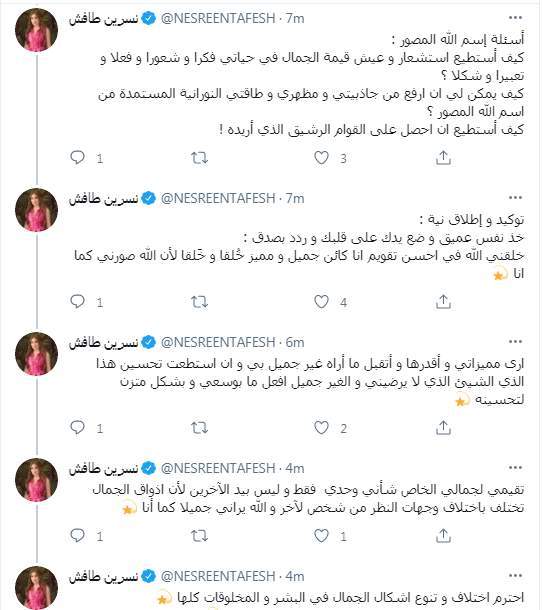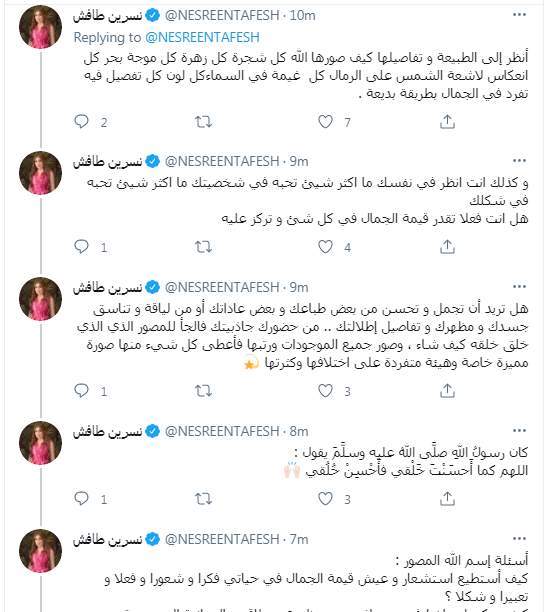 كما استغلت نشرين طافش البحث في اسم الله المتفرد "المصور" لتقييم ما تراه جميلًا فيها والرد على منتقديها قائلة: "تقيمي لجمالي الخاص شأني وحدي فقط وليس بيد الآخرين لأن اذواق الجمال تختلف باختلاف وجهات النظر من شخص لآخر والله يراني جميلا كما أنا".