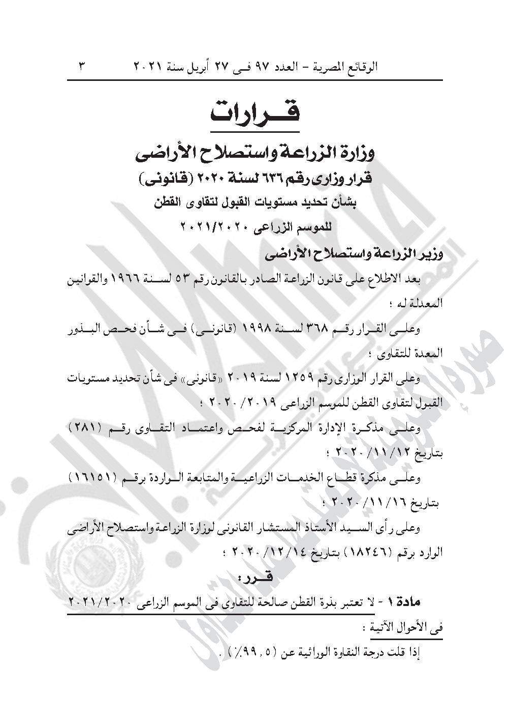 وحمل القرار الأول رقم 636 لسنة 2020 (قانوني)، بشأن عدم اعتبار بذرة القطن صالحة للتقاوى فى الموسم الزراعى 2020 /2021 فى الأحوال الآتية: