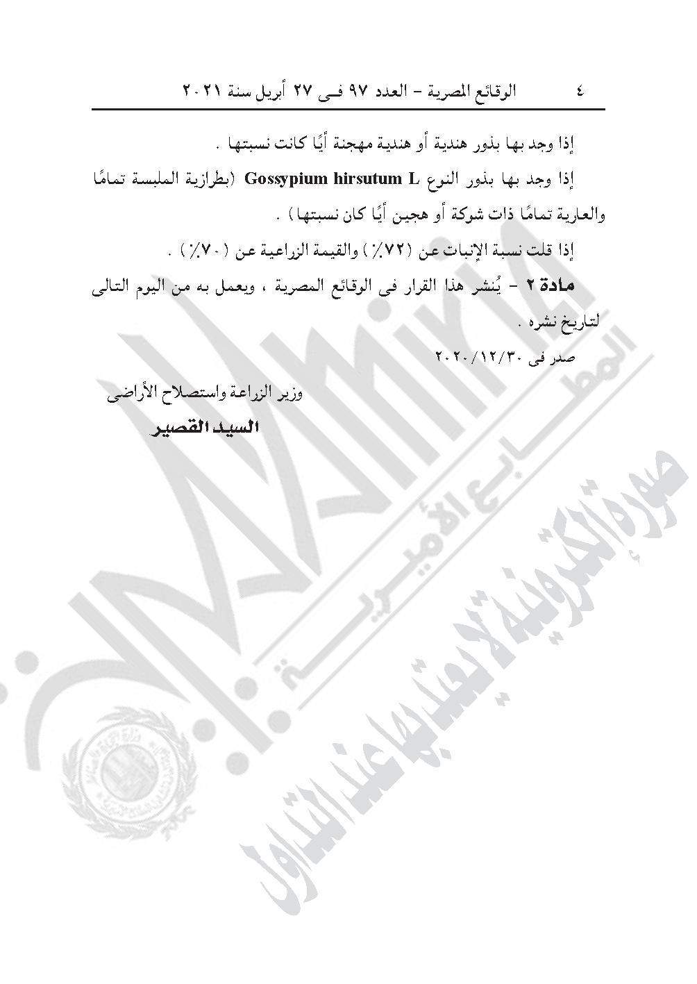 نشرت جريدة الوقائع المصرية في عددها رقم 97، الصادر في 27 أبريل 2021، قرارى وزارة الزراعة واستصلاح الأراضي بشأن بشأن تحديد مستويات القبول لتقاوى القطن للموسم الزراعى 2020 /2021، ومنح الحماية لبعض الأصناف النباتية.