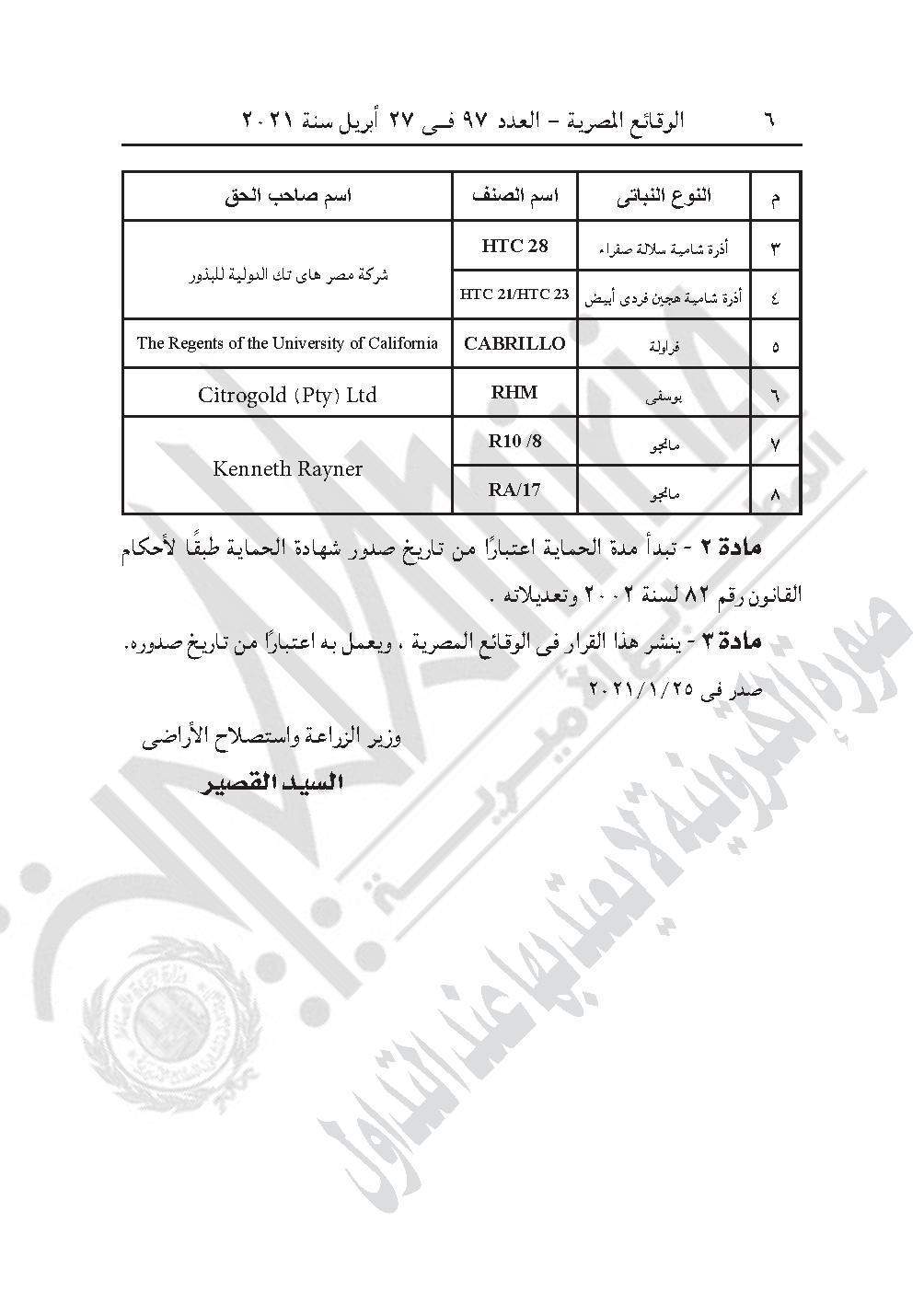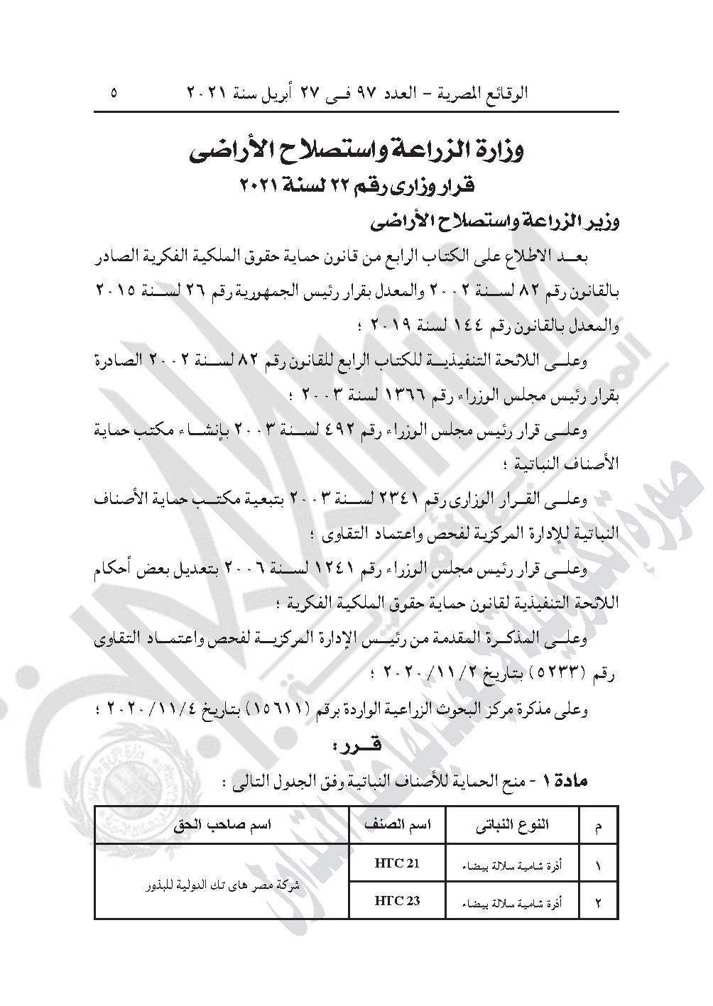 وحمل القرار الثاني رقم 22 لسنة 2021، بشأن منح الحماية للأصناف النباتية التالية: