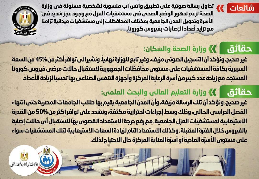 كما قام المركز الإعلامي لمجلس الوزراء بالتواصل مع وزارة التعليم العالي والبحث العلمي، والتي نفت تلك الأنباء، مؤكدةً أن تلك الرسالة مزيفة، وأن المدن الجامعية يقيم بها طلاب الجامعات المصرية حتى انتهاء الفصل الدراسي الحالي، وذلك وسط إجراءات احترازية مكثفة، ونشدد على توافر أكثر من 50% من القدرة الاستيعابية لمستشفيات العزل الجامعية، مع رفع درجة الاستعداد القصوى بها لاستقبال أي حالات إصابة بالفيروس خلال الفترة المقبلة، وكذلك الاستعداد التام لزيادة السعات الاستيعابية لتلك المستشفيات سواء على مستوى الأسرّة العادية أو أسرّة العناية المركزة حال الاحتياج لذلك.