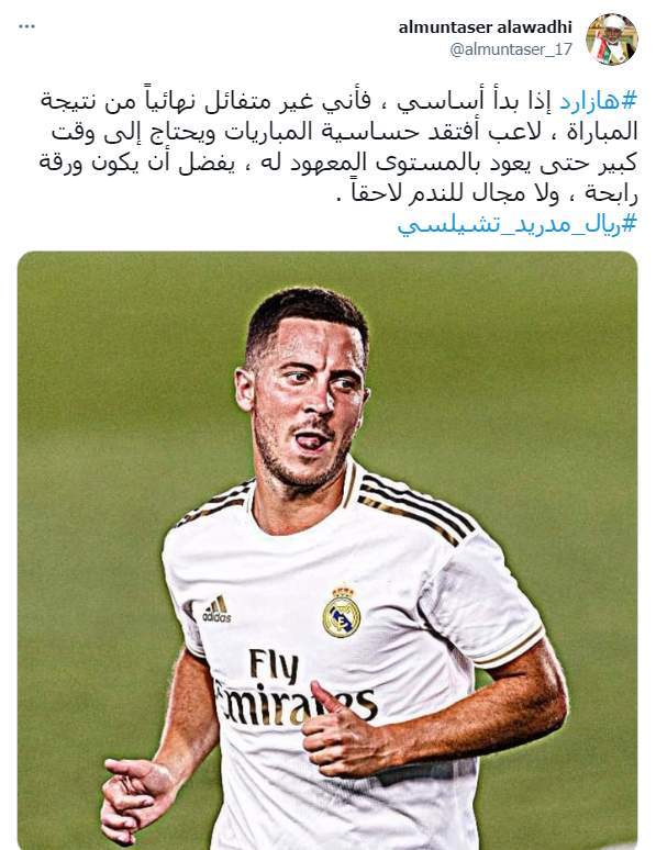 وقال المنتصر : "هازارد إذا بدأ أساسي ، فأني غير متفائل نهائياً من نتيجة المباراة ، لاعب أفتقد حساسية المباريات ويحتاج إلى وقت كبير حتى يعود بالمستوى المعهود له ، يفضل أن يكون ورقة رابحة ، ولا مجال للندم لاحقاً".