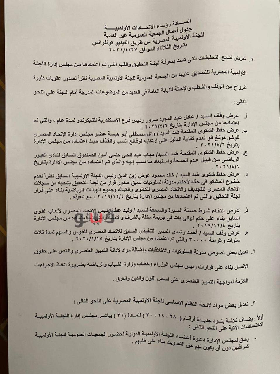 عقد مجلس إدارة اللجنة الأولمبية المصرية اجتماع الجمعية العمومية غير العادية مساء الثلاثاء الموافق 27 ابريل الجاري وكان جدول أعمال الجمعية العمومية كالأتي: