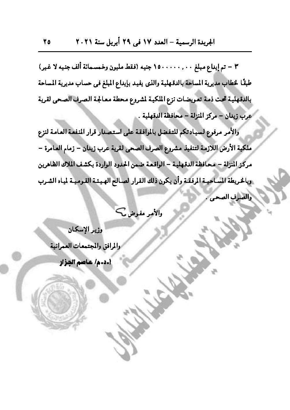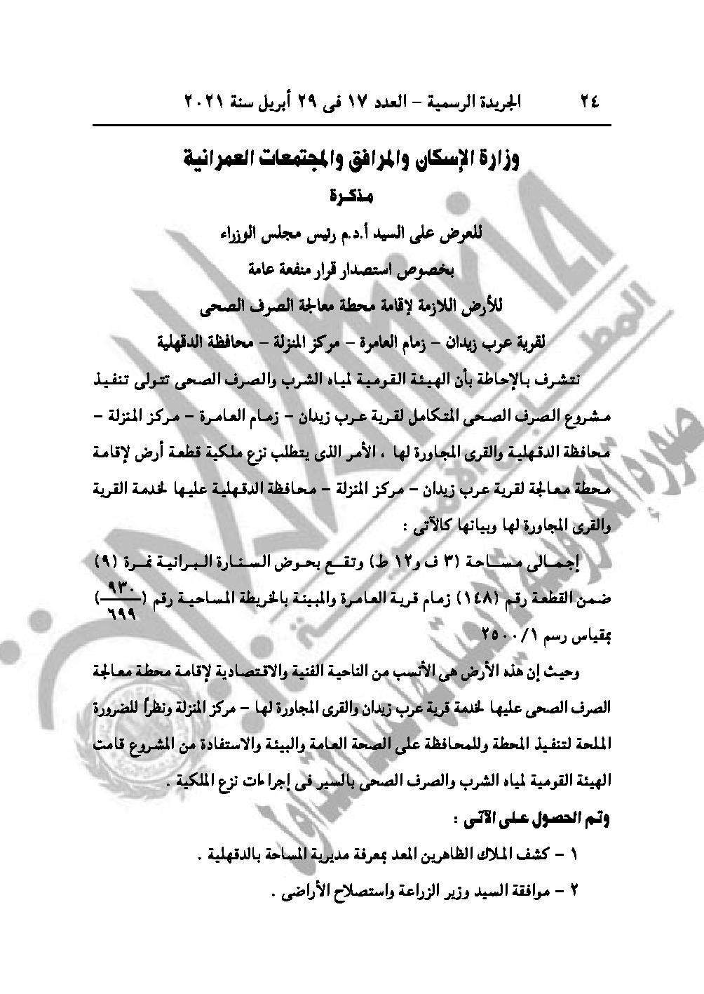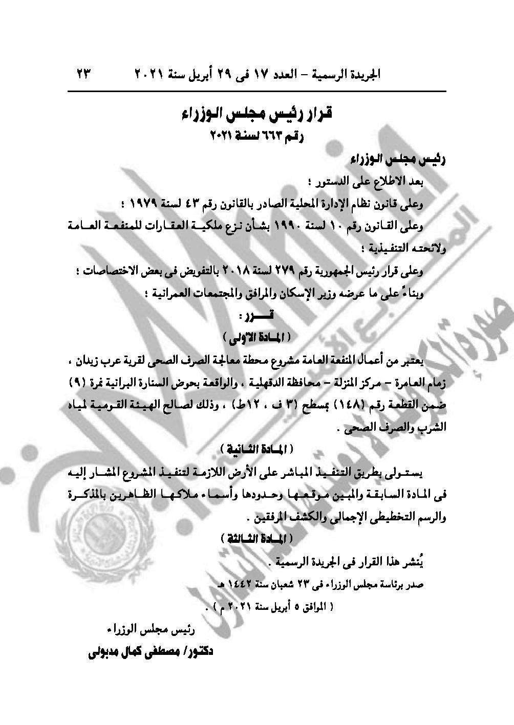 القرار رقم 663 لسنة 2021، باعتبار مشروع محطة معالجة الصرف الصحي لقرية عرب زيدان زمام العامرة، مركز المنزلة محافظة الدقهلية من أعمال المنفعة العامة.