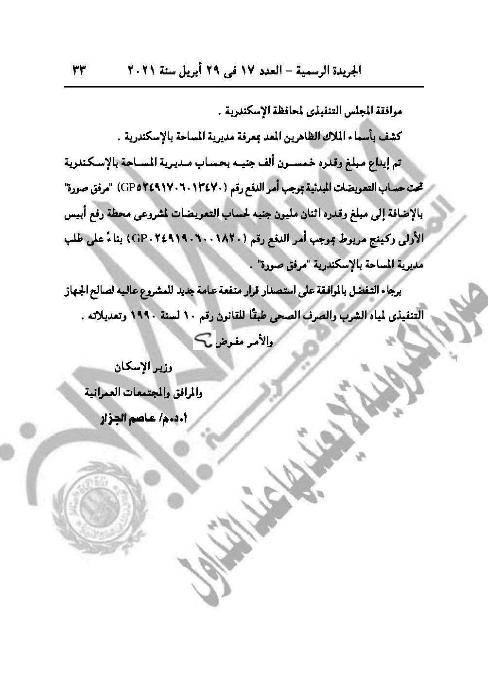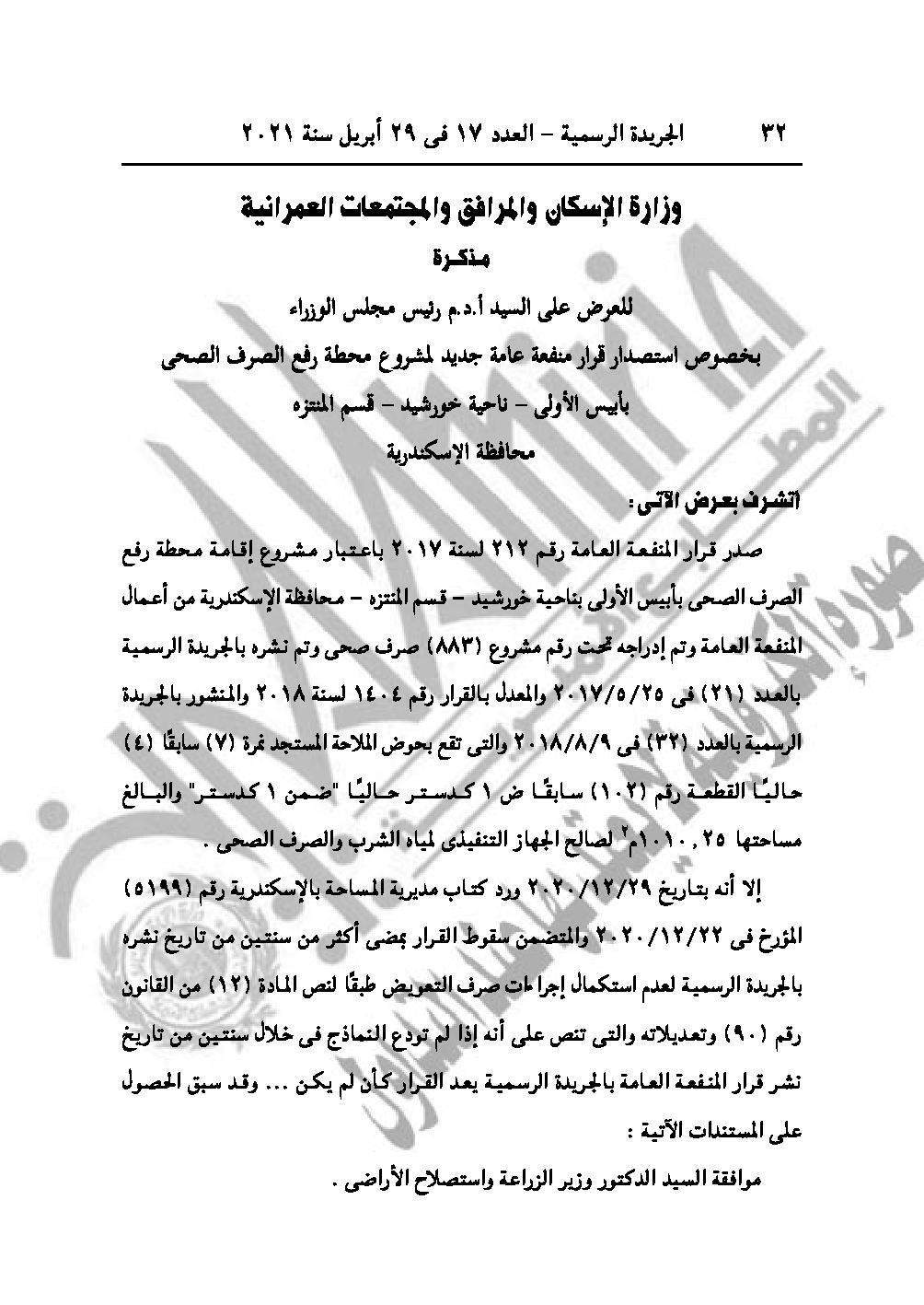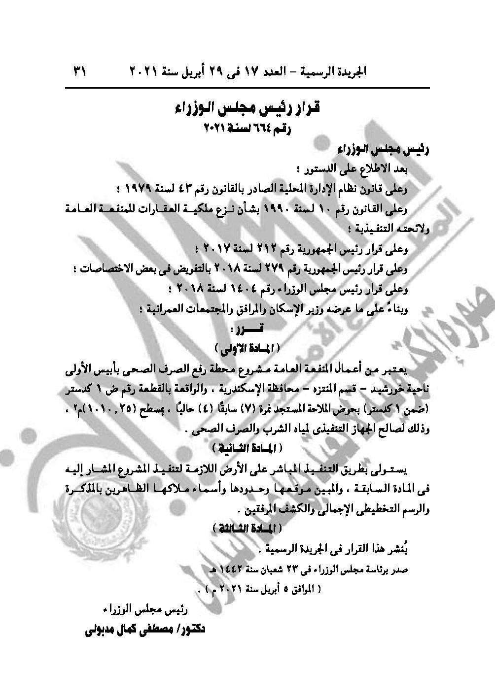 والقرار رقم 664 لسنة 2021 باعتبار مشروع محطة رفع الصرف الصحي بأبيس الأولى ناحية خورشيد قسم المنتزة محافظة الإسكندرية من أعمال المنفعة العامة.