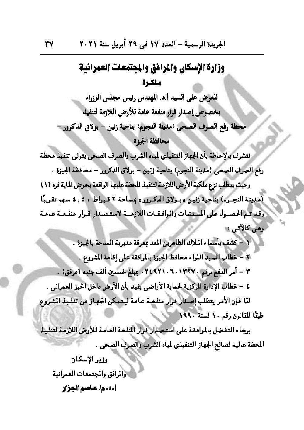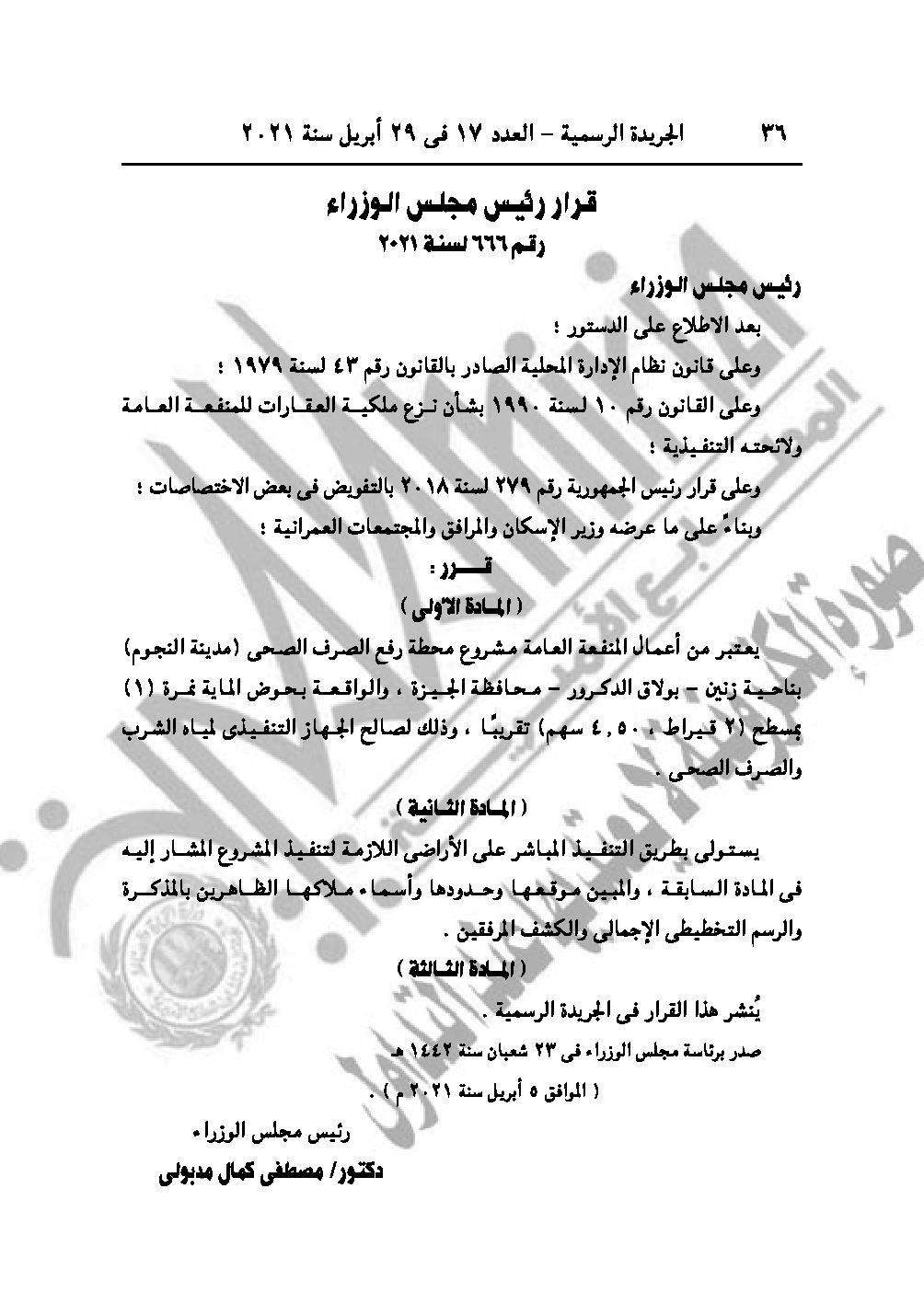 وقرار رقم 666 لسنة 2021 باعتبار مشروع محطة رفع الصرف الصحي مدينة النجوم بناحية زنين، بولاق الدكرور محافظة الجيزة من أعمال المنفعة العامة.