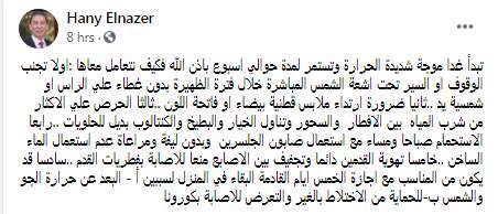 وكتب هاني الناظر تدوينة على الفيس بوك قال فيها: تبدأ موجة شديدة الحرارة وتستمر لمدة حوالي أسبوع بإذن الله فكيف نتعامل معاها: