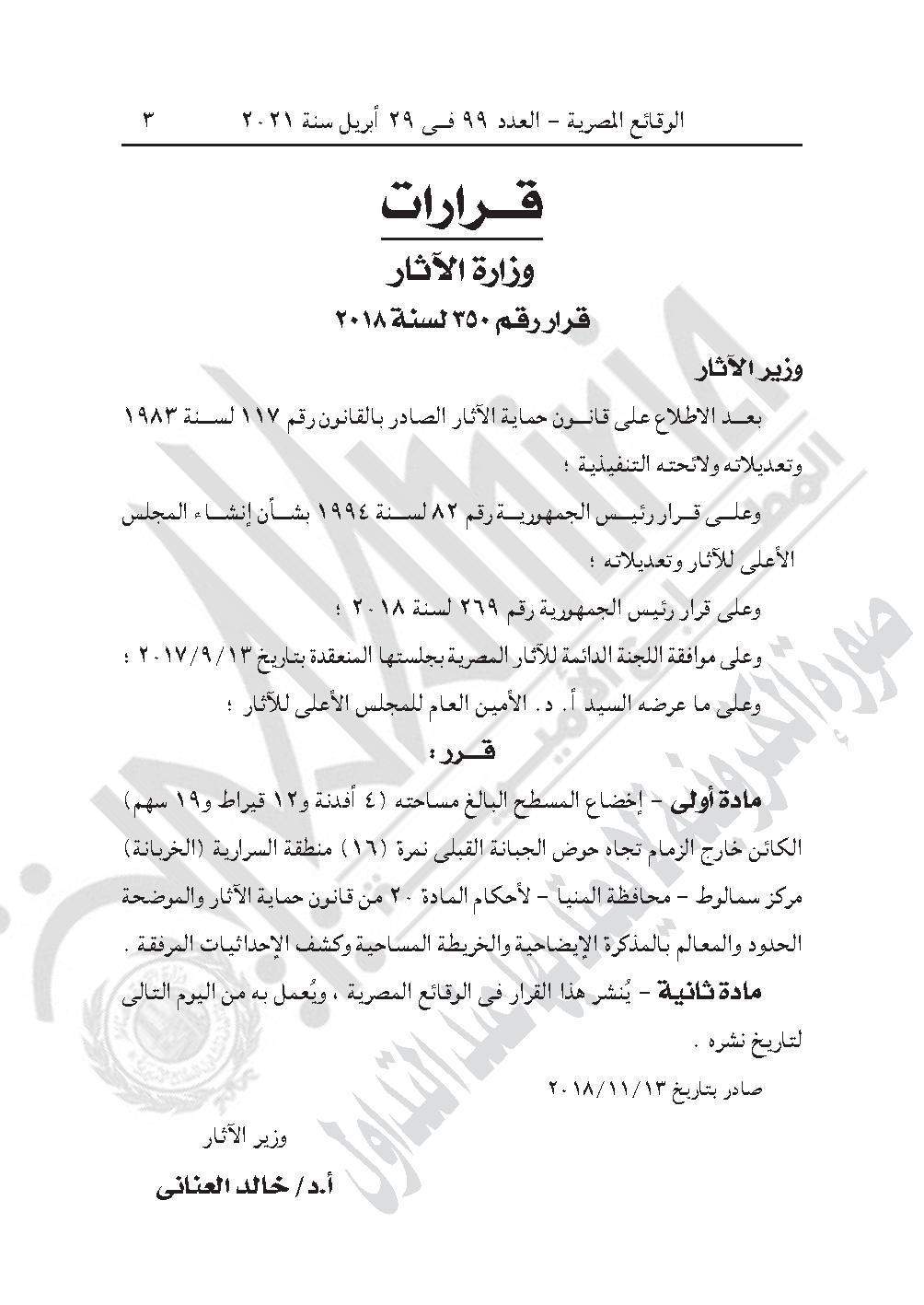 القرار رقم 350 لسنة 2018، بشأن إخضاع المسطح البالغ مساحته (4 أفدنة و12 قيراط و19 سهم) الكائن خارج الزمام تجاه حوض الجبانة القبلى نمرة (16) منطقة السرارية (الخربانة)، مركز سمالوط محافظة المنيا - لأحكام المادة 20 من قانون حماية الآثار والموضحة الحدود والمعالم بالمذكرة الإيضاحية والخريطة المساحية وكشف الإحداثيات.