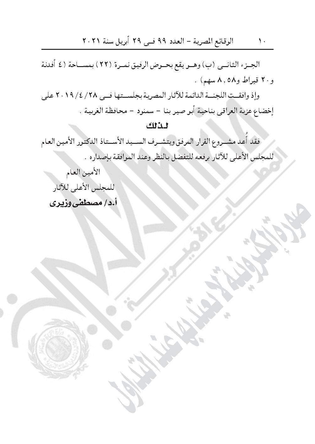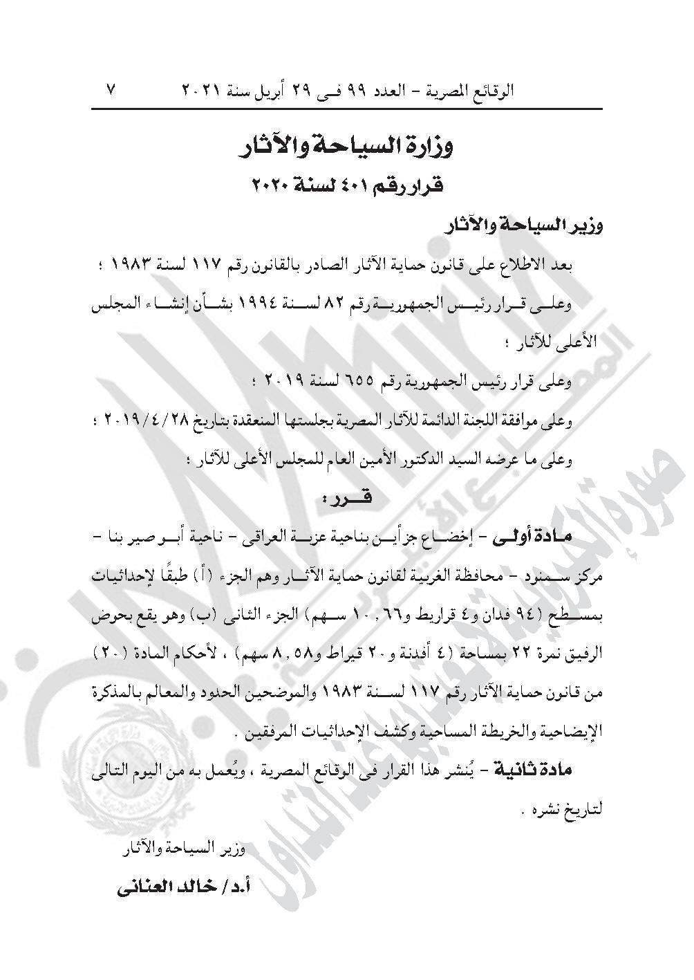 والقرار رقم 401 لسنة 2020، بشأن إخضاع جزأين بناحية عزبة العراقى، ناحية أبو صير بنا مركز سمنود بمحافظة الغربية لقانون حماية الآثار، وهم الجزء (أ) طبقًا لإحداثيات بمسطح (94 فدان و4 قراريط و10٫66 سهم) الجزء الثاني (ب).
