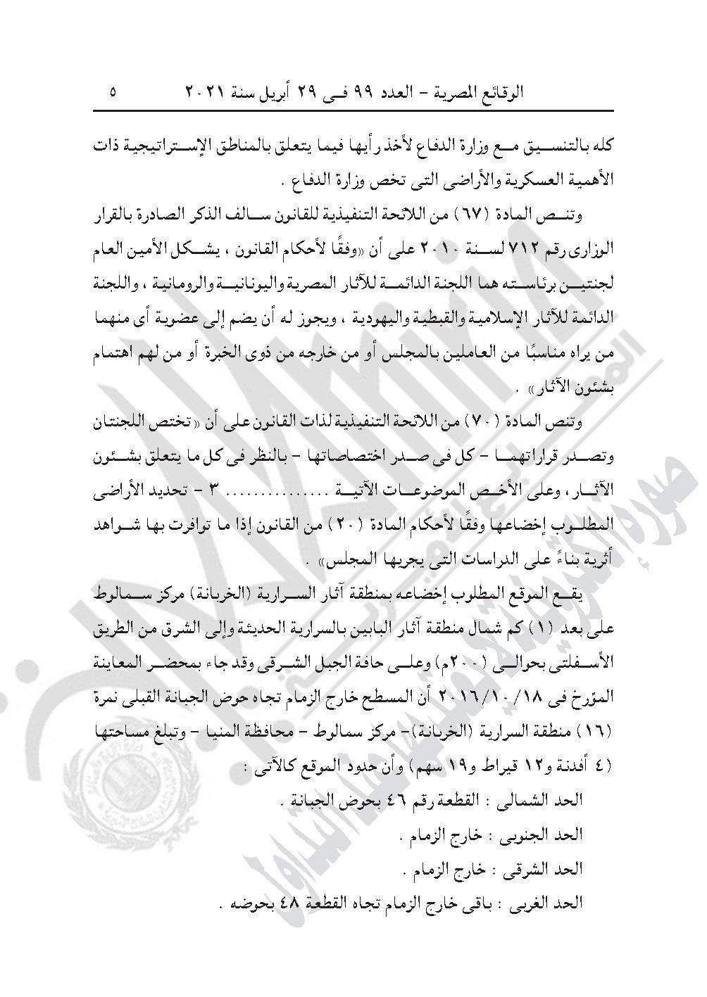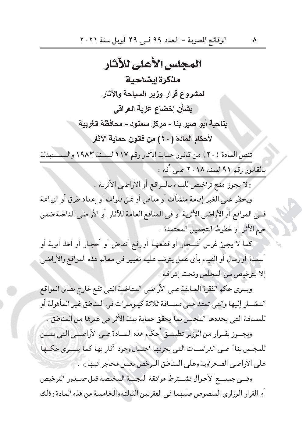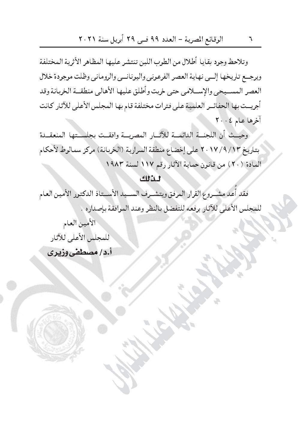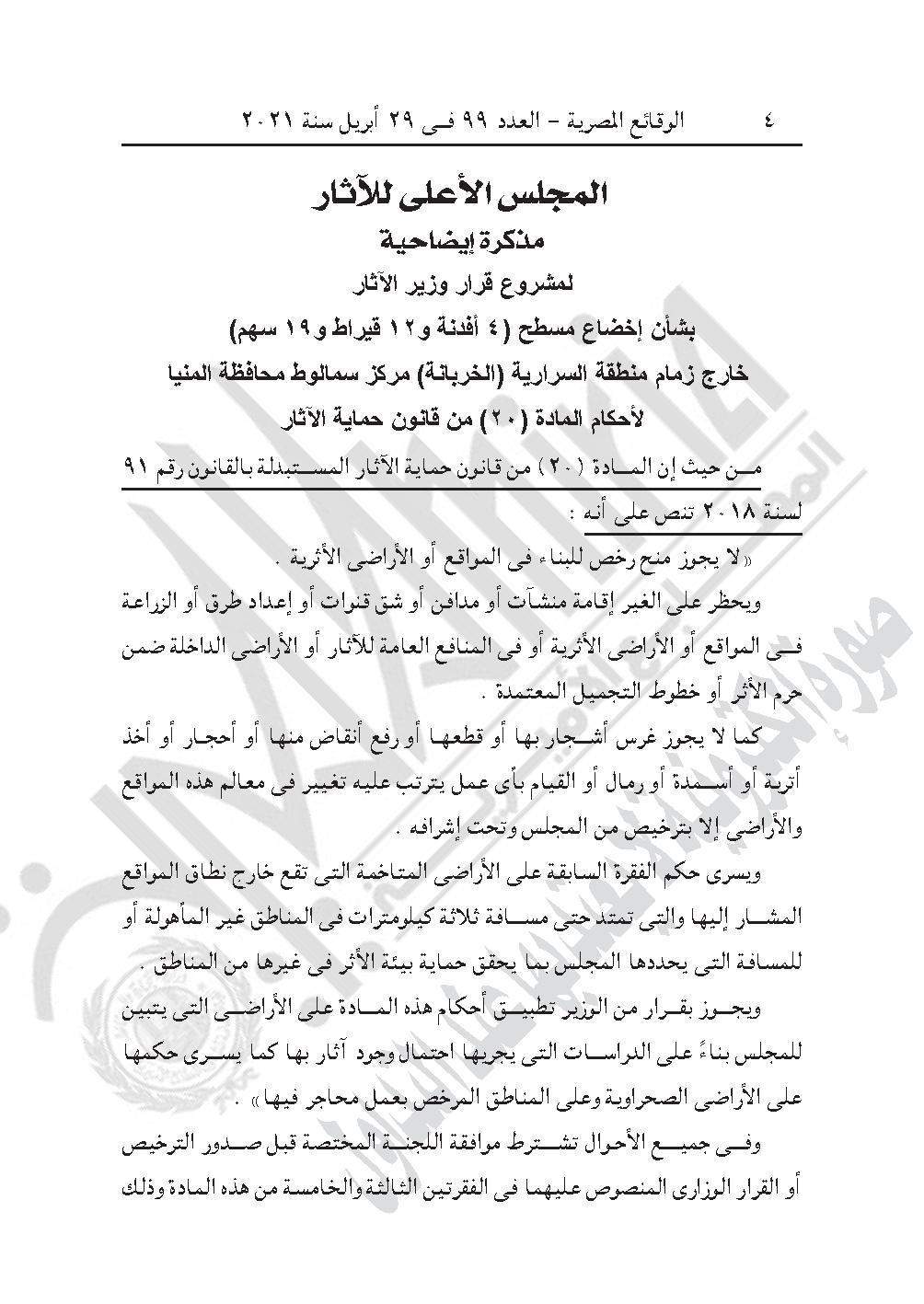 نشرت جريدة الوقائع المصرية في عددها رقم 99، الصادر في 29 أبريل 2021، قرارى وزارة السياحة والآثار بشأن إخضاع أرض خارج الزمام تجاه حوض الجبانة القبلى منطقة السرارية (الخربانة) مركز سمالوط محافظة المنيا، وجزأين بناحية عزبة العراقى، ناحية أبو صير بنا مركز سمنود بمحافظة الغربية لقانون حماية الآثار.