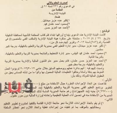 وقالت المحكمة عبر أسباب حكمها أن المخالفة المنسوبة للمحالة الأولى كلير عبده عزيز، مدير إدارة التعليم الفني بمديرية التربية والتعليم بالدقهلية، والتي تتمثل في أنها تقاعست عن اتخاذ الإجراءات المقررة حيال الاستفادة من مبلغ (41,055000) جنيه, المخصص لتطوير برنامج التعليم الفني بمديرية التربية والتعليم بالدقهلية (بند المعدات والآلات), وكذا مبلغ (5,297000) جنيه (بند التجهيزات) رغم حاجة المديرية الماسة لذلك المبلغ مما ترتب عليه حرمان المديرية من الاستفادة منه في تحسين أداء العملية التعليمية وإعادته لوزارة المالية دون مبرر مقبول