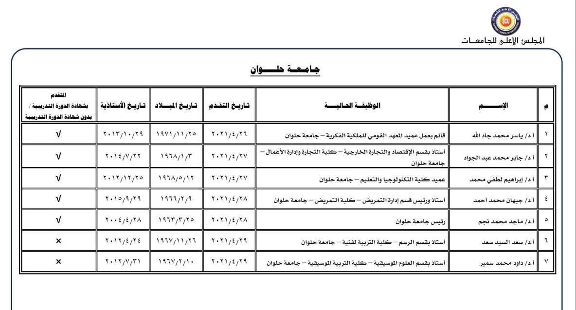 وكشف المجلس الأعلي للجامعات، عن القوائم المبدئية للمرشحين لرئاسة جامعة حلوان وهم 7 مرشحين: