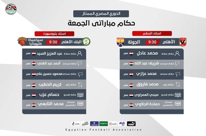 أعلنت لجنة الحكام الرئيسية بالاتحاد المصري لكرة القدم، حكام مباراتي الجمعة ببطولة الدوري الممتاز، على النحو التالي: