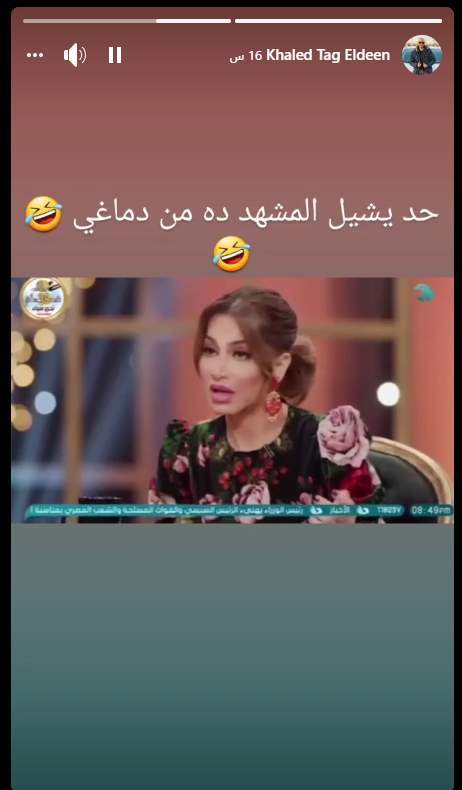 ونشر تاج الدين عبر "ستوري" حسابه بموقع التواصل الاجتماعي "فيس بوك" مشهد من الحلقة ظهر فيه عمرو مصطفى والإعلامية يتحدثون عن أغنية للفنان تامر حسني وهي تحمل اسم "كل مرة بشوفك فيها".