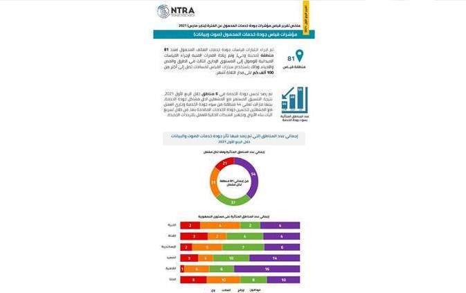 وتم رصد تحسن جودة الخدمة في 6 مناطق خلال الربع الأول 2021، نتيجة التنسيق المستمر مع المشغلين لحل مشاكل جودة الخدمة، بينما مازالت 44 منطقة تعاني سوء جودة الخدمة، وجاري العمل مع المشغلين لتحسين جودة الخدمات المقدمة بها، من خلال تسريع آليات بناء الأبراج، وتجهيز الشبكات الحالية للعمل بالترددات الجديدة مما يساهم في رفع مستوى جودة الخدمات المقدمة للمستخدمين بهذه المناطق.