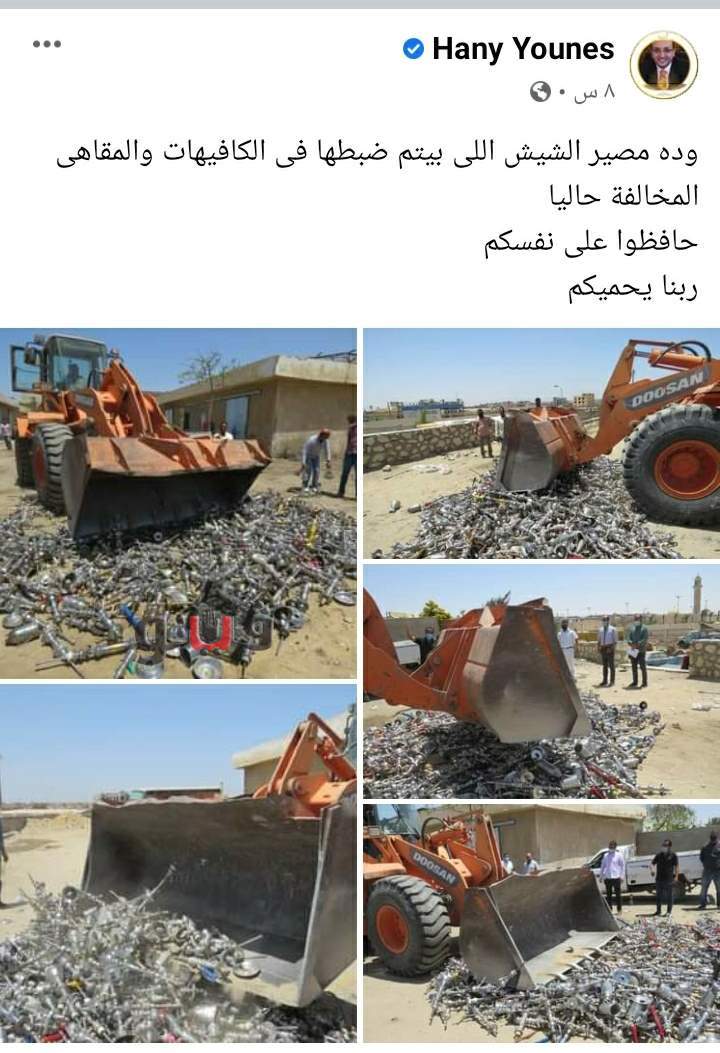 ونشر هاني يونس المستشار الإعلامي لرئيس مجلس الوزراء، عبر صفحته الرسمية بموقع التواصل الإجتماعي "فيسبوك" عدة صور لإعدام أعدادًا من الشيشة التي يتم مصادرتها من المقاهى والمولات المخالفة، قائلًا: "ده مصير الشيش اللى يتم ضبطها في الكافيهات والمقاهى المخالفة حاليا.. حافظوا على نفسكم".
