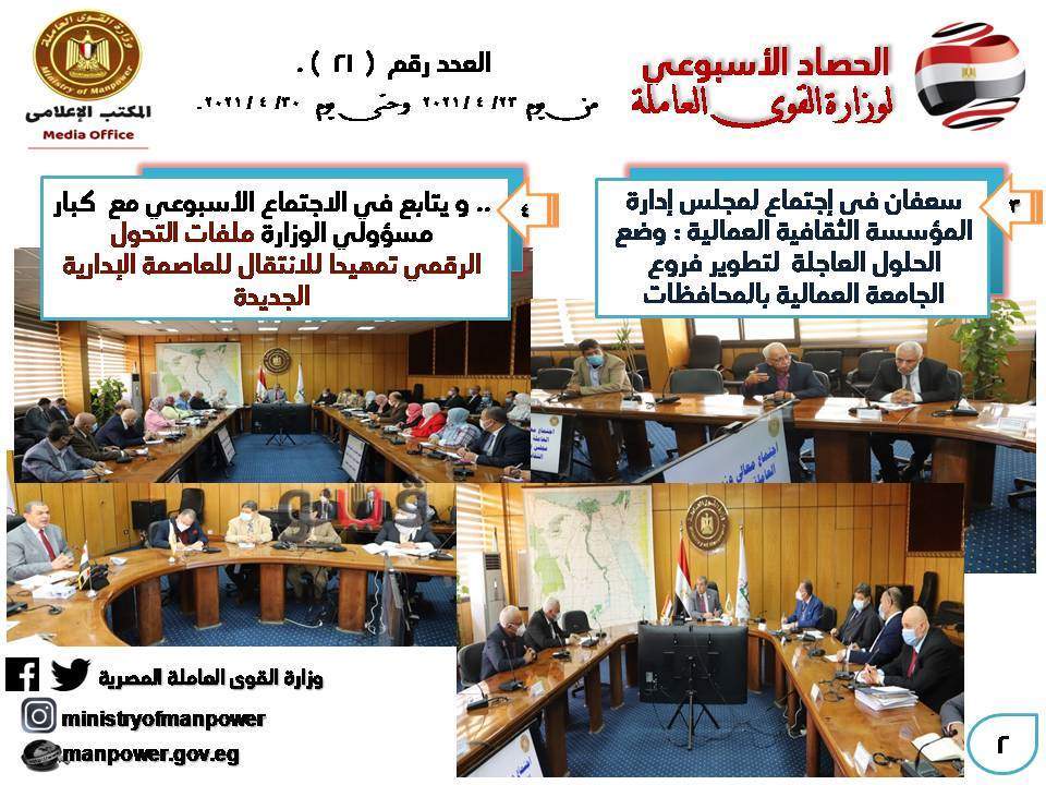 وفيما يلي تفاصيل ما جاء بالحصاد الأسبوعي، حيث عقد محمد سعفان وزير القوي العاملة، بديوان عام الوزارة، اجتماعا مهما لمجلس إدارة المؤسسة الثقافية العمالية، تمهيدا لوضع الحلول العاجلة فيما يخص تطوير فروع الجامعة العمالية بالمحافظات، والجهات التي يمكن التعاون معها في هذا الشأن.
