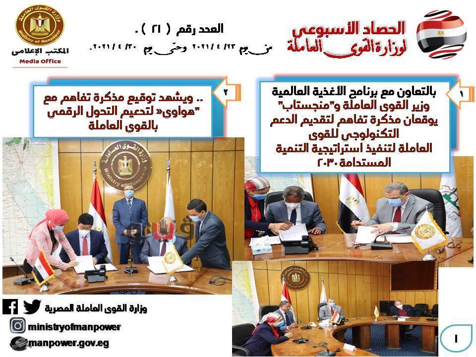 شهد حصاد الأسبوع الحالي، في وزارة القوى العاملة العديد من الأحداث المهمة خلال الفترة من 23 إلى 30 أبريل الجاري منها عقد اجتماع مهم مع كبار مسئولي الوزارة لمتابعة التقدم المحرز في التحول الرقمي ، وآخر لمجلس إدارة المؤسسة الثقافية العمالية لتطوير فروع الجامعة العمالية ، وتوقع 3 مذكرات تفاهم مع برنامج الأغذية العالمي التابع للأمم المتحدة لتدعيم التحويل الرقمي، وشركة "هواوي للتكنولوجيا" مصر، لتعزيز استراتيجية التنمية المستدامة، وجمعية مسجد الدكتور مصطفى محمود لمساندة العمالة غير المنتظمة، فضلا عن تعيين 8484 شاباً في 6 محافظات، وتحصيل مستحقات تعادل قيمتها 15.5 مليون جنيه تقريبا من الأردن والسعودية وقطر.