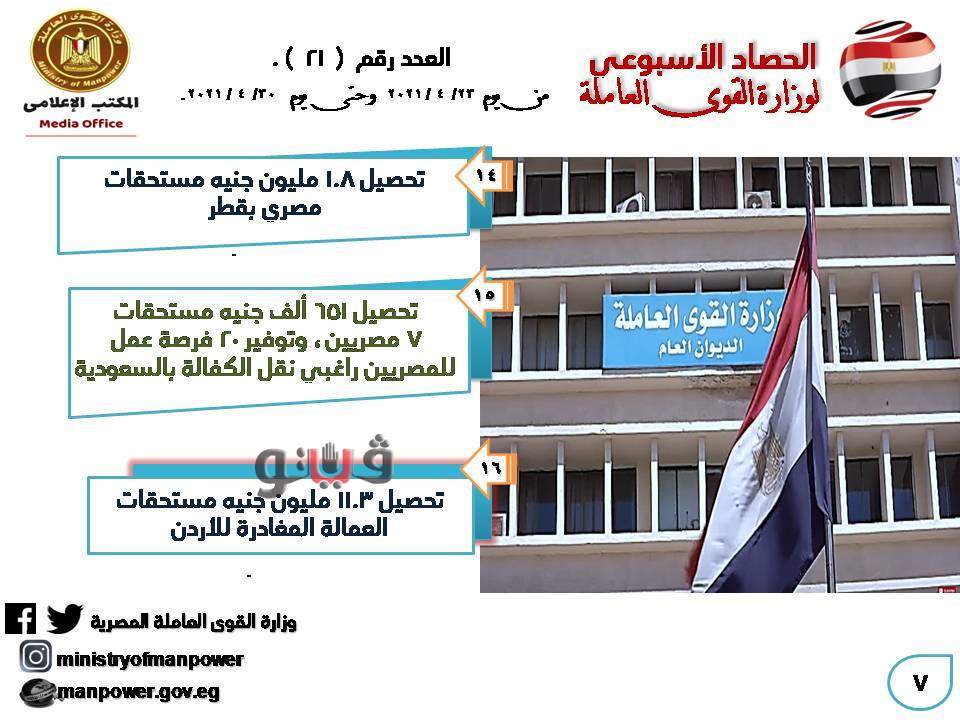 كما استطاع مكتب التمثيل العمالي التابع للوزارة بالسفارة المصرية بعمان-الأردن، بالمتابعة اللحظية والجهود المبذولة والمقابلات مع المسئولين بمؤسسة الضمان الاجتماعي بالأردن، واستكمالا لما تم تحويله سابقا، تم تحويل القائمة العشرين من مستحقات الضمان الاجتماعي لنحو 675 عامل مصري لدى المؤسسة غادروا عمان نهائيا.