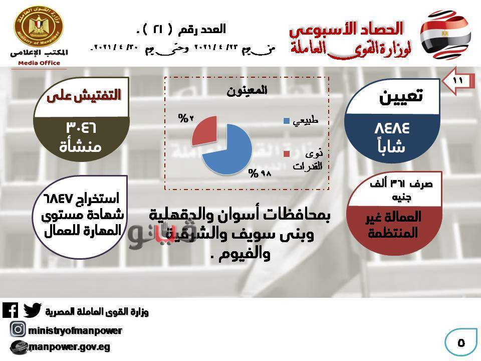 وعلي جانب آخر شمل حصاد الأسبوع تعيين 8 آلاف و 484 شاباً في 6 محافظات، وصرف منح للرعاية الاجتماعية والصحية للعمالة غير المنتظمة المسجلة بمديريات القوى العاملة بمحافظات أسوان، والدقهلية، وبني سويف، والشرقية، والفيوم، بلغت 361 ألفاً و200 جنيه، والتفتيش على 3046 منشأة لتطبيق أحكام القانون، فضلاً عن إستخراج 6847 شهادة قياس مستوى المهارة، ورخصة مزاولة الحرفة لـ 6847 عاملا.