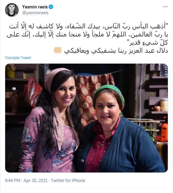 ونشرت ياسمين رئيس صورة تجمعها بالفنانة دلال عبد العزيز معلقة عليها قائلة: "أذهب البأس ربّ النّاس، بيدك الشّفاء، ولا كاشف له إلّا أنت يا ربّ العالمين.. اللهمّ لا ملجأ ولا منجا منك إلّا إليك، إنّك على كلّ شيءٍ قدير.. دلال عبد العزيز ربنا يشفيكي ويعافيكي".