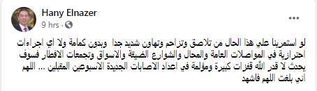 وكتب هاني الناظر تدوينة على الفيس بوك: " لو استمرينا علي هذا الحال من تلاصق وتزاحم وتهاون شديد جدا وبدون كمامة ولا اي اجراءات احترازية في المواصلات العامة والمحال والشوارع الضيقة والأسواق وتجمعات الإفطار فسوف يحدث لا قدر الله قفزات كبيرة ومؤلمة في أعداد الإصابات الجديدة الأسبوعين المقبلين.. اللهم إني بلغت اللهم فاشهد".