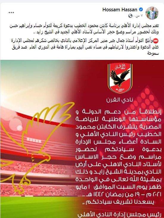 وكتب حسام حسن عبر حسابه: " أبلغ التوأم أستاذ جمال جبر مدير المركز الإعلامي بالنادي بخالص شكرهما لمجلس الإدارة علي الدعوة واعتذرا لارتباطهما في مساء نفس اليوم بمباراة هامة في الدوري العام ضد فريق سموحة"