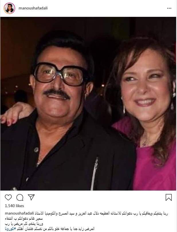 ونشرت منة فضالي صورة للثنائي معلقة عليها قائلة: "ربنا يشفيكم ويعافيكم يا رب دعواتكم للاستاذه العظيمه دلال عبد العزيز و سيد المسرح والكوميديا الاستاذ سمير غانم دعواتكم بالشفاء.. وربنا يشفي كل مريض يا رب.. المرض زايد جدا يا جماعه خلو بالكم من نفسكم علشان أهلكم #كورونا".